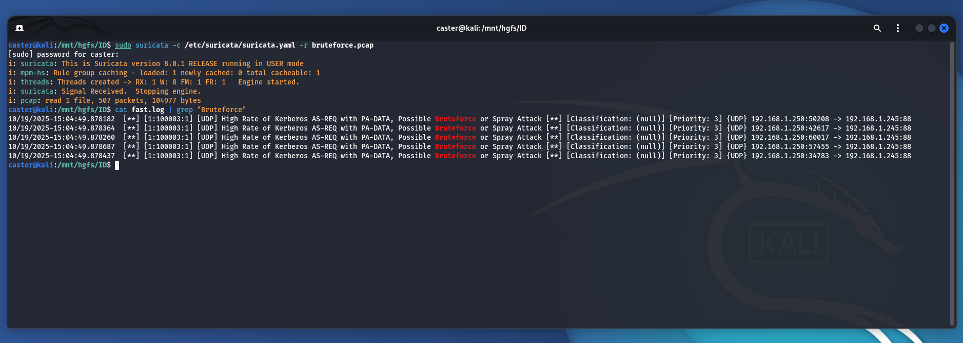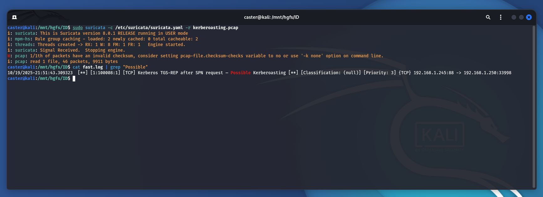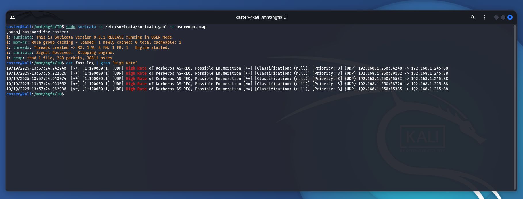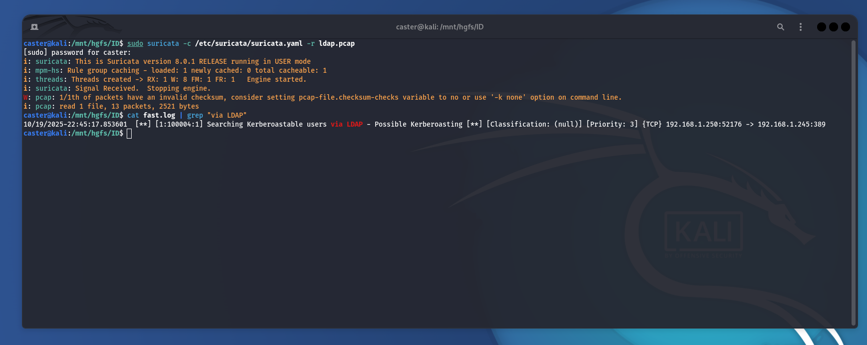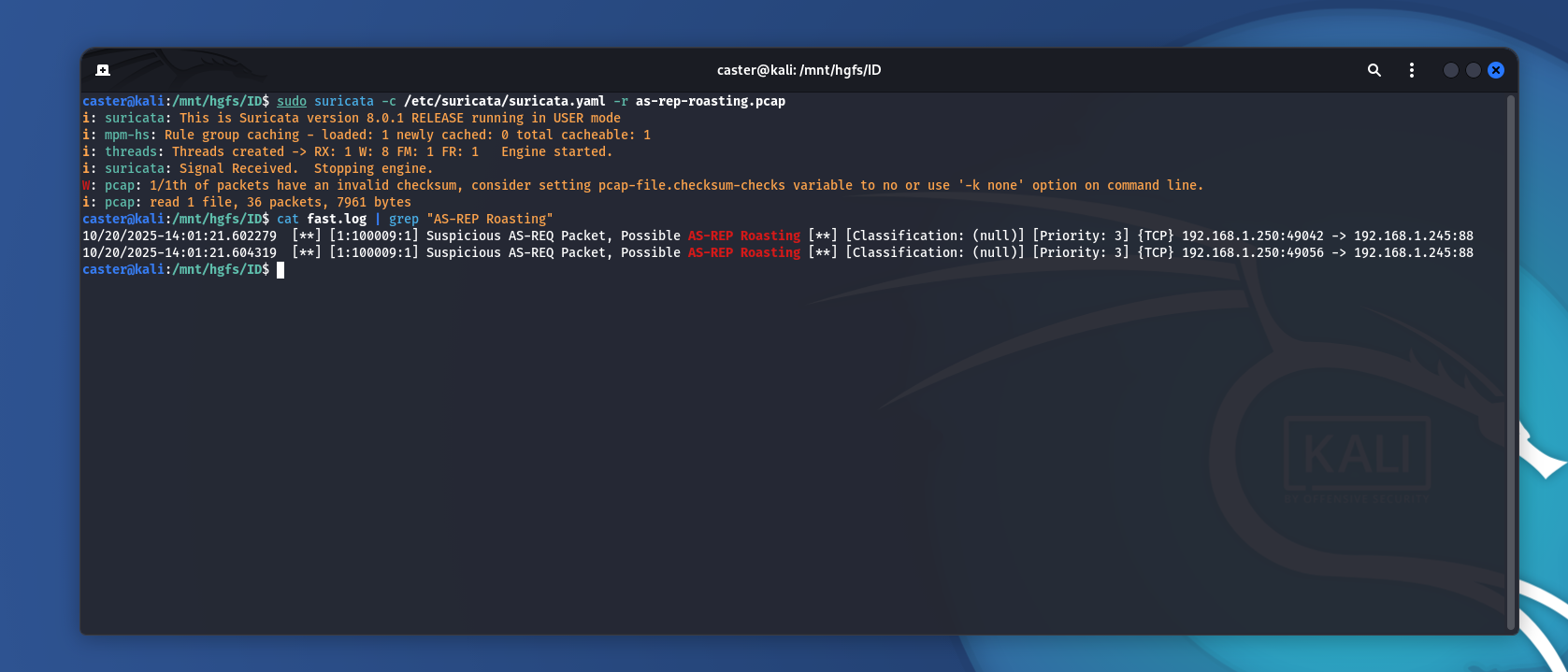 caster@kali:/mnt/hgfs/ID$ sudo suricata -c /etc/suricata/suricata.yaml -r as-rep-roasting.pcap